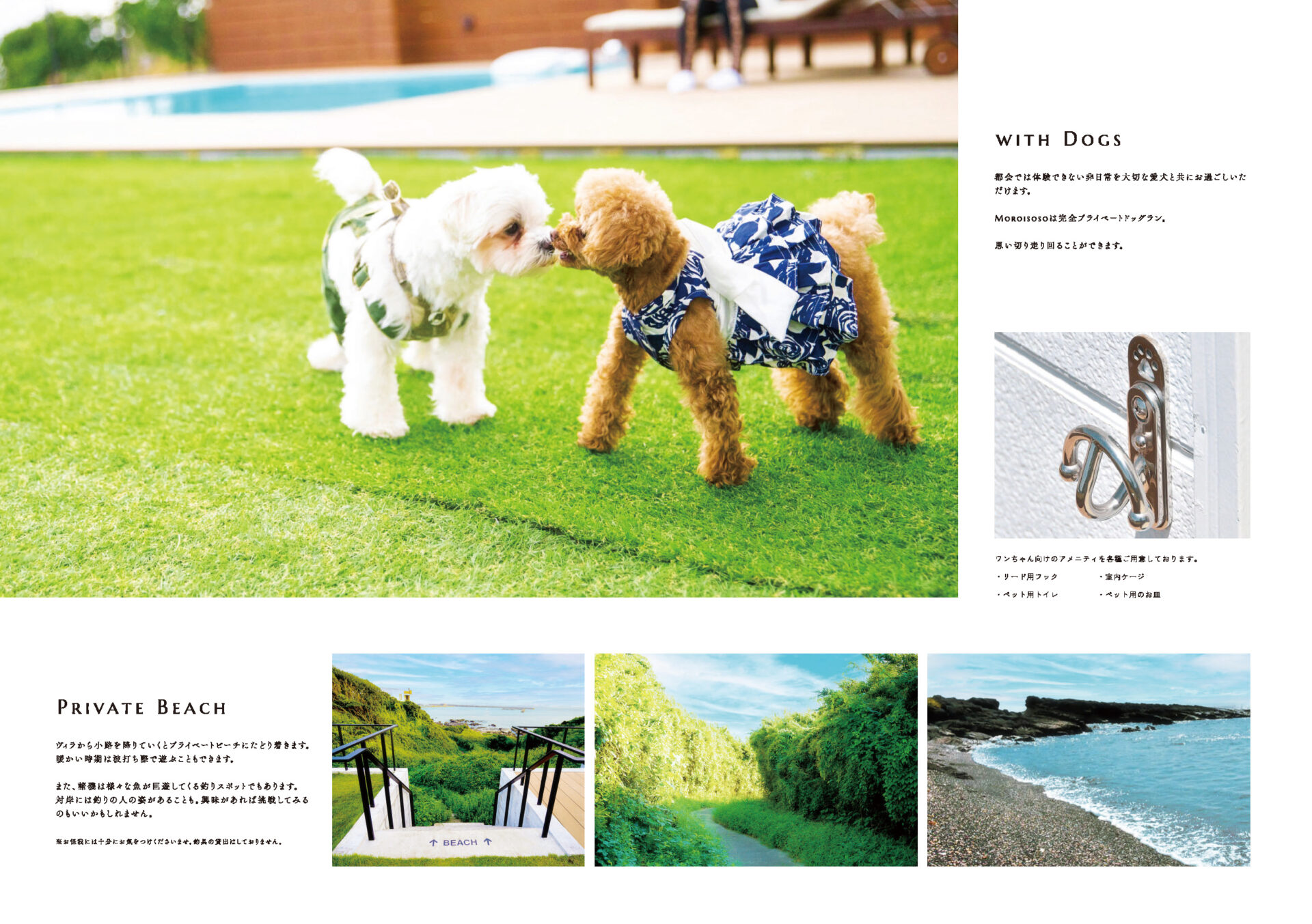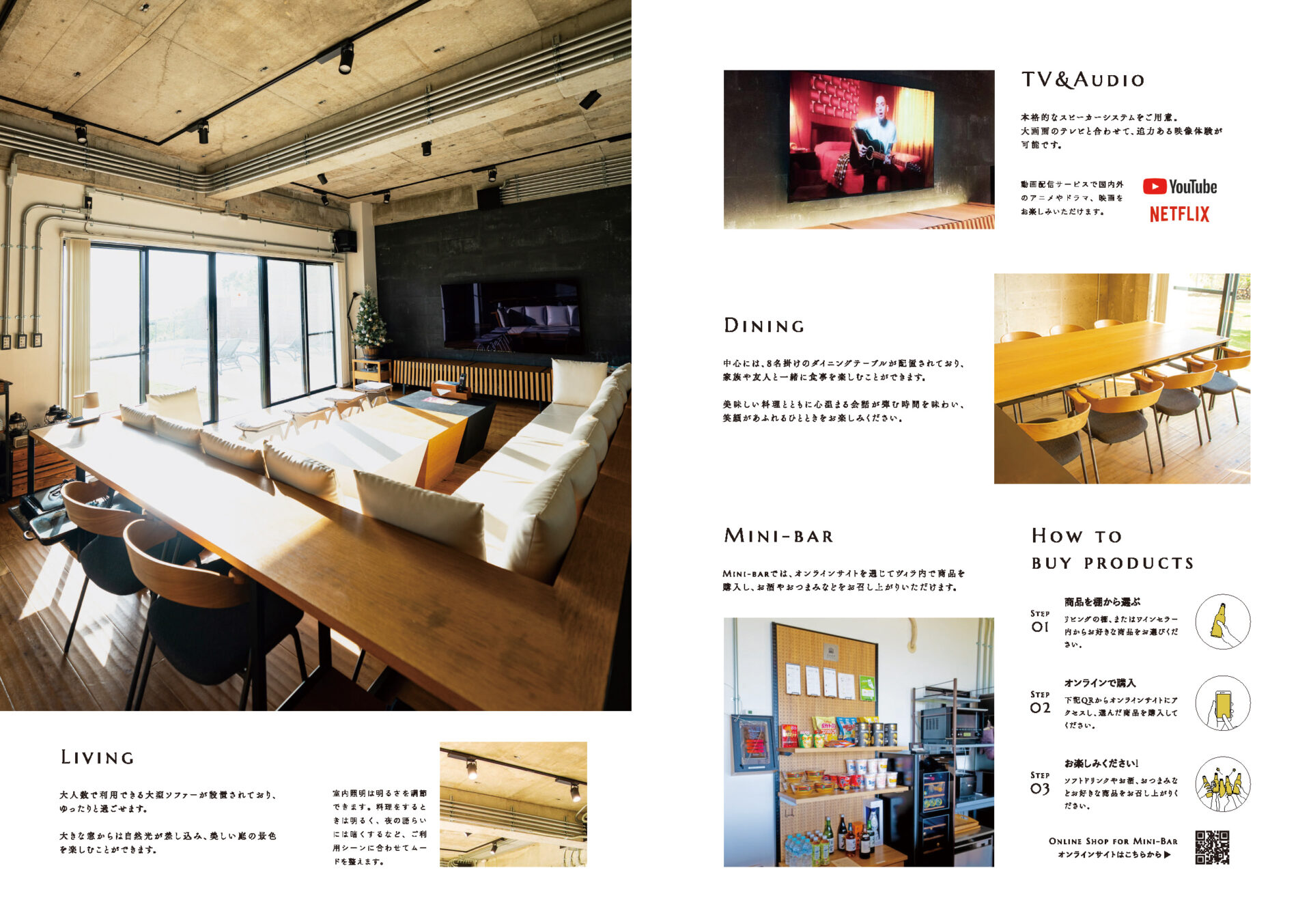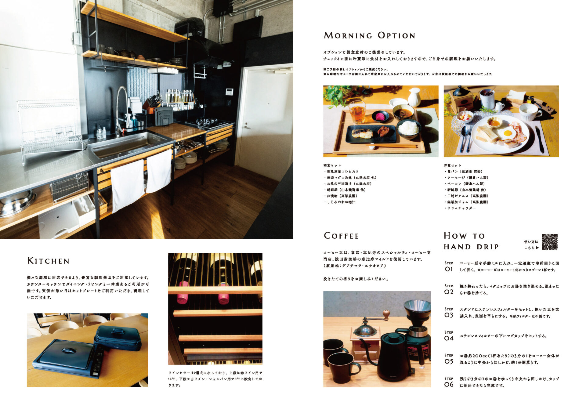 MOROISOSOの施設紹介パンフレットを制作しました。 施設のリニューアルに伴い、パンフレットの内容も一新。 建物の外観やインテリア、プールやBBQ設備、サウナ、アメニティなど、多岐にわたる魅力を視覚的に訴求しながら、「この施設で過ごす時間」そのものをイメージできるような構成とデザインに仕上げました。 また、備品の使い方やルールがひと目で伝わるよう、機能性とホスピタリティを両立させた誌面設計を意識しています。 実際に滞在するゲストが手に取ることで、期待感を高めつつ、安心して施設を活用していただけるような導線を目指しました。